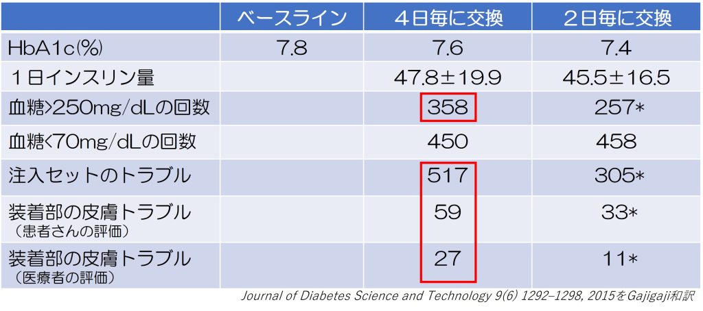 2つ目のグループの人たちは、最初の3ヶ月間は4日おきに注入セット交換を行い、少し期間を空けたのちに(Washout後に)次の3ヶ月間は2日おきに注入セット交換を行いました。
